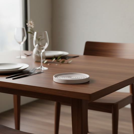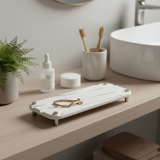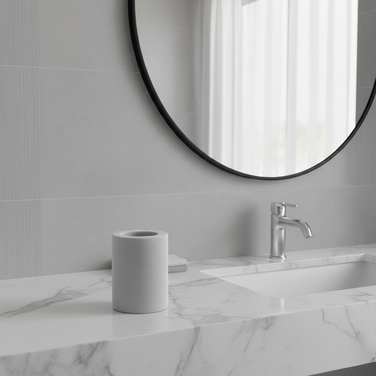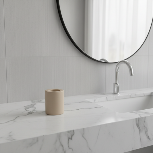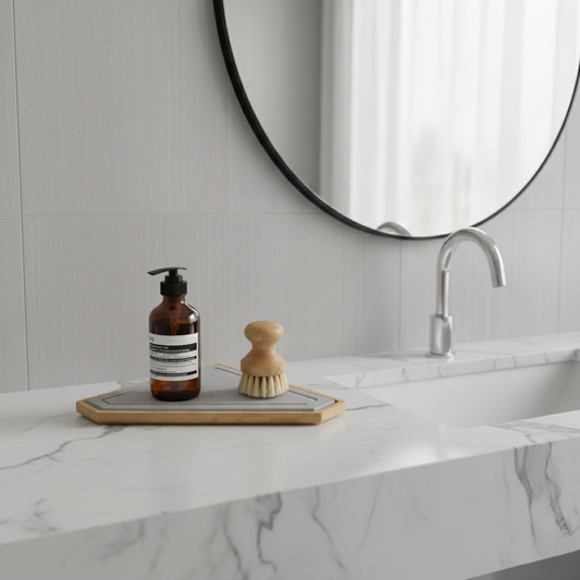 | Nature minérale | Tapis en diatomite gris clair, pont en bois huilé, gobelet minéral posé hors éclaboussures. |